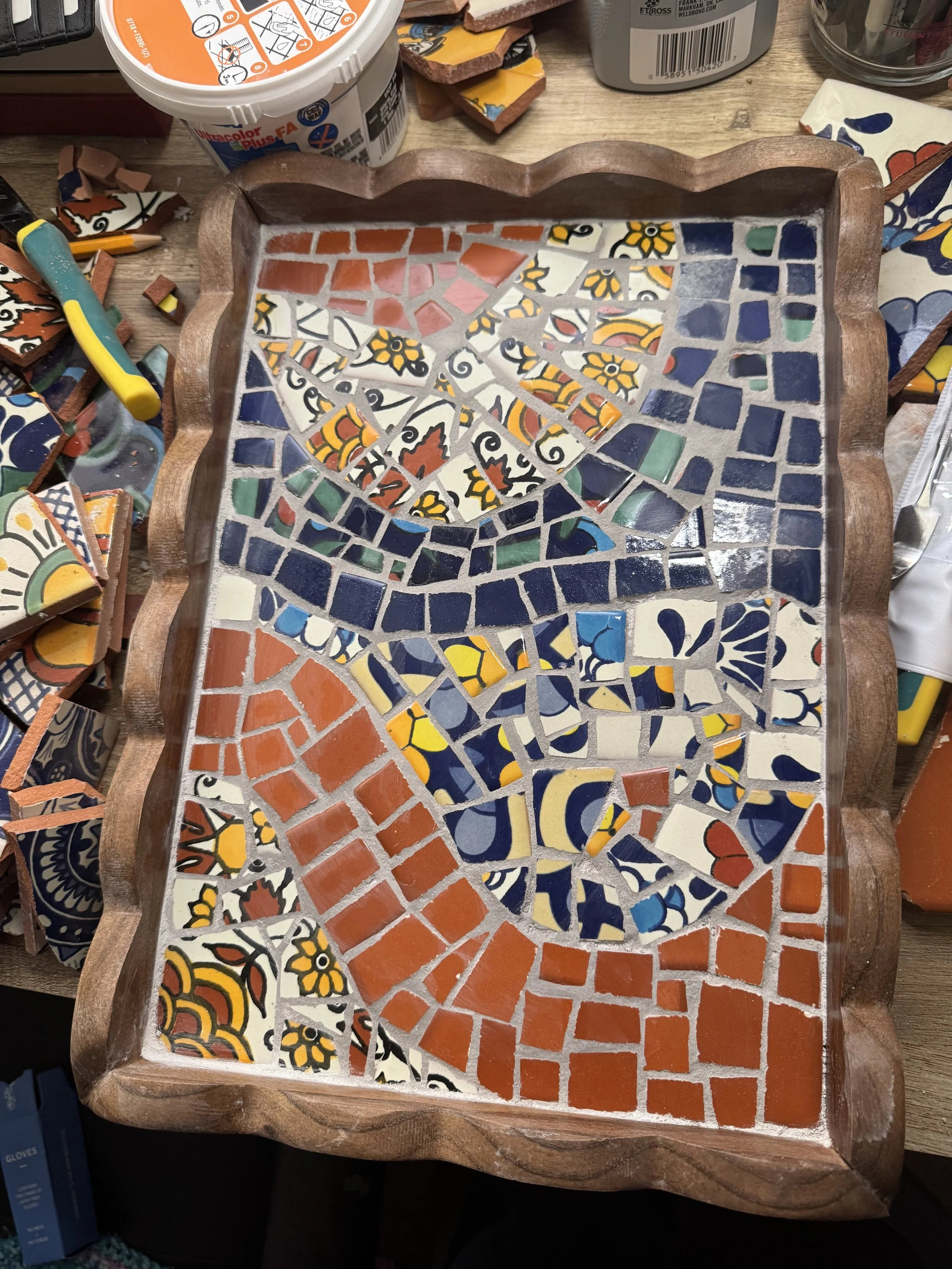 Here is the piece shortly after adding grout. I returned later to clean up the residue.
