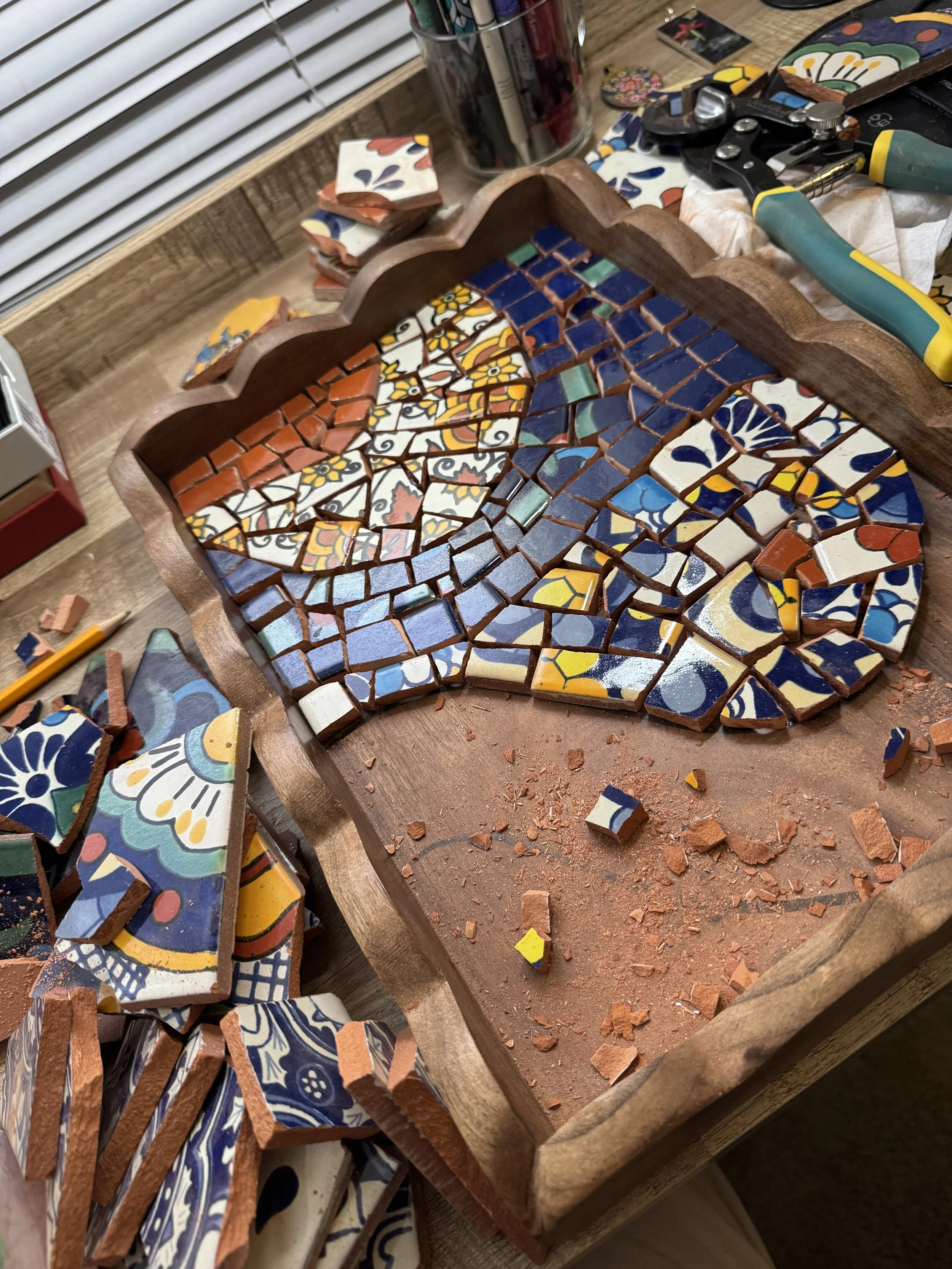 The mosaic tradition stretches back 5,000 years to Mesopotamia. Early mosaics—composed of stone, glass, shells, and clay—served decorative and practical purposes, as they do today. I’d been feeling that ancient calling recently and succumbed to it sometime in the middle of the winter, which had been unusually long for the temperate Mid Atlantic region. I kept my first project simple, opting to repurpose building materials. I ordered a box of broken Mexican talavera tiles, which cost more to ship than purchase.